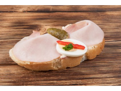 Složení: pšeničné pečivo 28% (pšeničná mouka, pitná voda, řepkový olej, pekařské droždí, zlepšující přípravek /guarová mouka, cukr, pšeničný lepek, emulgátor E472e, pšeničný kvas sušený, maltodextrin, protispékavá látka (E341, E170), řepkový olej, kyselina ascorbová, enzymy/, sůl), eidam 30% 27% (mléko, sůl, sýrařské kultury), pomazánkové máslo 22% (pasterizovaná smetana, rostlinný tuk, sušené mléko, modifikovaný škrob, sůl), vejce vařená, okurek sterilovaný, sterilovaná paprika, kadeřavá petržel,