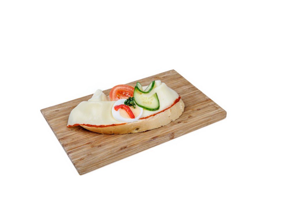 Složení: pšeničné pečivo 28% (pšeničná mouka, pitná voda, řepkový olej, pekařské droždí, zlepšující přípravek /guarová mouka, cukr, pšeničný lepek, emulgátor E472e, pšeničný kvas sušený, maltodextrin, protispékavá látka (E341, E170), řepkový olej, kyselina ascorbová, enzymy/, sůl), eidam 30% 27% (mléko, sůl, sýrařské kultury), pomazánkové máslo 22% (pasterizovaná smetana, rostlinný tuk, sušené mléko, modifikovaný škrob, sůl), vejce vařená, okurek sterilovaný, sterilovaná paprika, kadeřavá petržel,