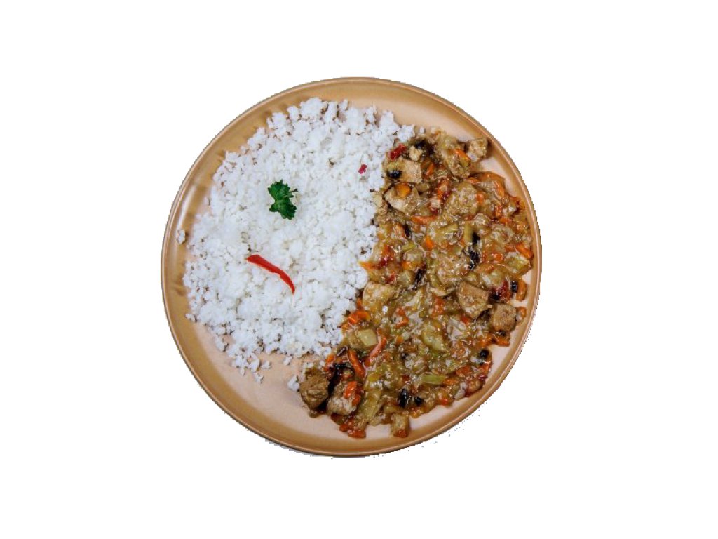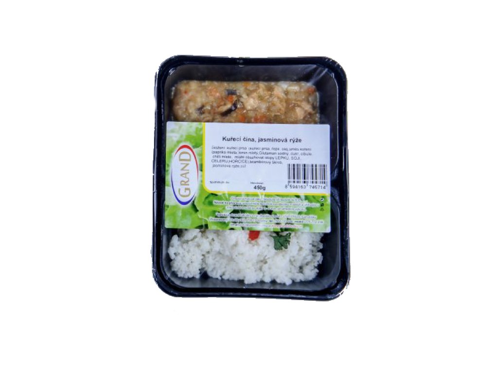 Složení: kuřecí prsa, řepkový olej, směs koření(paprika mletá, kmín mletý, Glutaman sodný, cukr, cibule, chilli mleté, může obsahovat stopy LEPKU, SÓJI, CELERU, HOŘČICE), bramborový škrob, jasmínová rýže, sůl, pórek, zelí bílé, houba Shi-ta-ke, SÓJOVÉ KLÍČKY, červená paprika, mrkev, cibule, bambusové výhonky